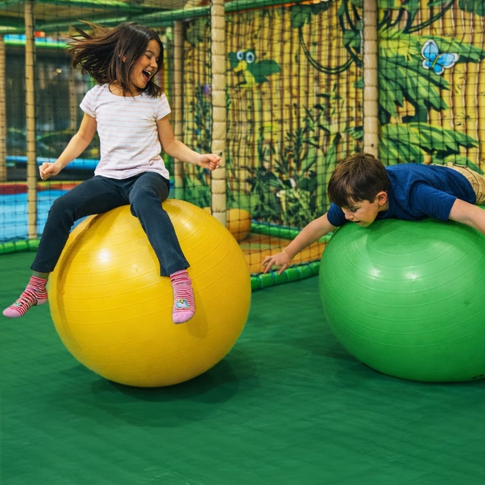 In Mega Balls, play literally revolves around giant balls. Kids push, roll, bounce and hug them. One tries to balance on top, another rolls a ball forward with serious determination — and soon you’ll hear laughter. This is full-body play, and the fun comes from doing it together.