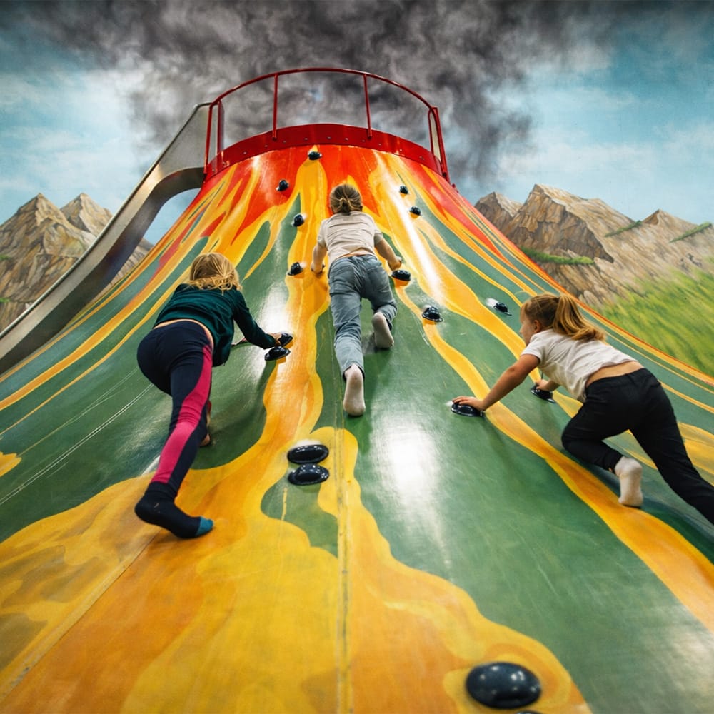 The volcano invites you to climb towards the top. Climbing holds along the slope guide you upward step by step, and along the way you get to test strength, balance and bravery. Once you reach the top, there’s a reward waiting — a fast slide back down into the fun.