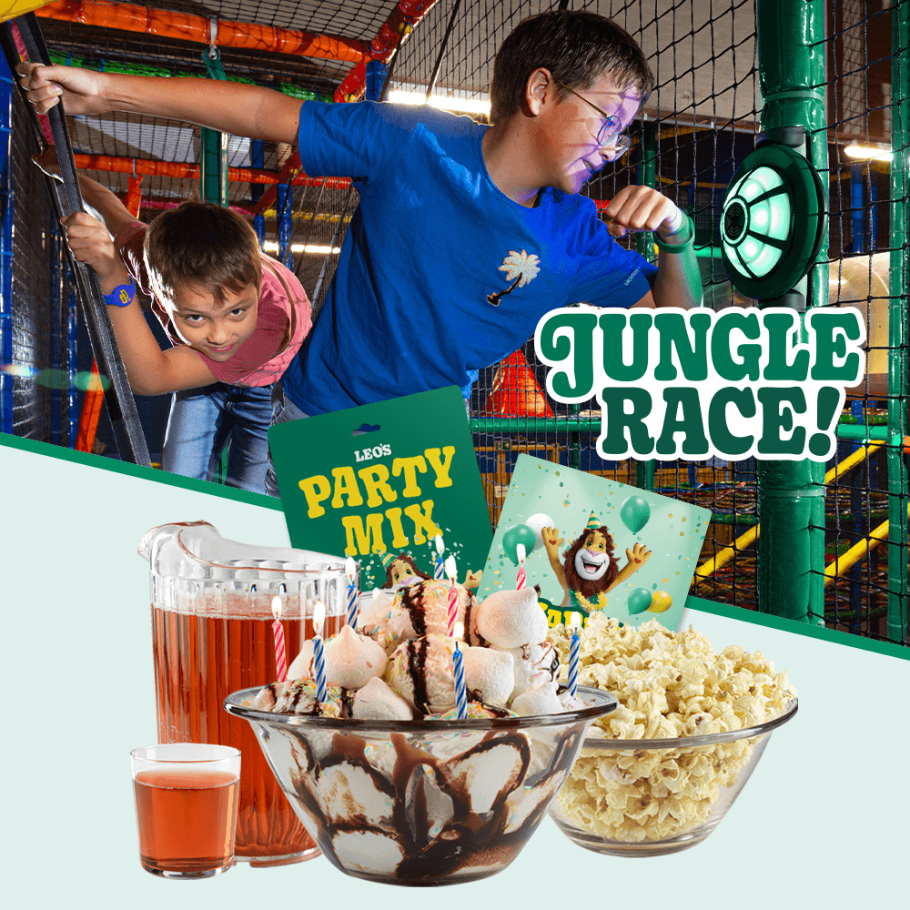 Leo’sin superherkullinen jäätelöpallokakku sisältää jäätelöä, marenkia, suklaakastiketta ja strösseleitä. Ja asiaan kuuluvat tietysti kynttilät, jotka sankari saa juhlavasti puhaltaa! Synttäriohjaaja varmistaa, että juhlat sujuvat. Jäätelökakku saapuu onnittelulaulun kera ja ohjaaja on tarvittaessa paikalla täydentämässä tarjoiluita. Ohjaaja ei ole huoneessa koko tunnin ajan. Jungle Race Jäätelökekkereihin sisältyy: