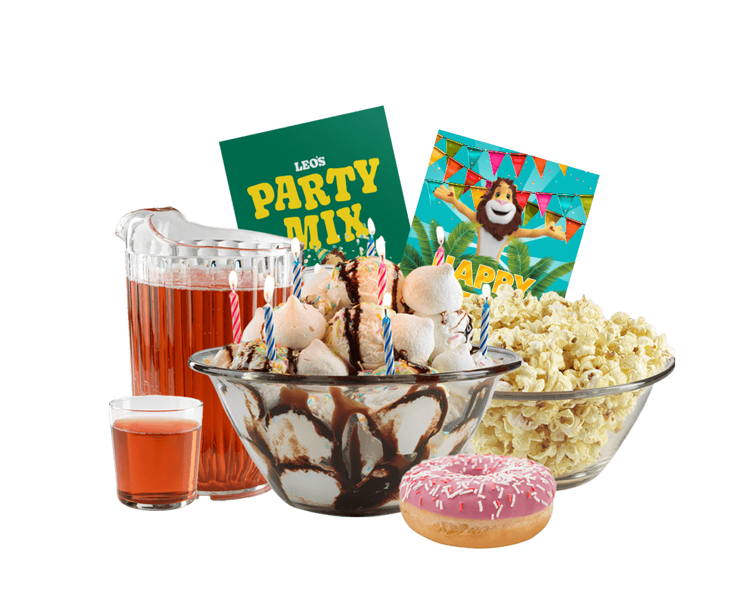Synttärisankari ansaitsee mahtavan juhlan! Meillä Leo’sissa sankari saa valita itse teemahuoneen, joka koristellaan ja katetaan herkullisilla tarjottavilla. Huoneesta löytyy herkullisia donitseja, suussa sulava jäätelöpallokakku, rapeita popcorneja sekä raikasta mehua ja vettä. Juhlahumun jälkeen seikkailupuisto kutsuu sankarin ja vieraat leikkimään ja riekkumaan! Unelmasynttärit jätskipallokakulla ja donitseilla on saatavilla valikoiduissa puistoissa.