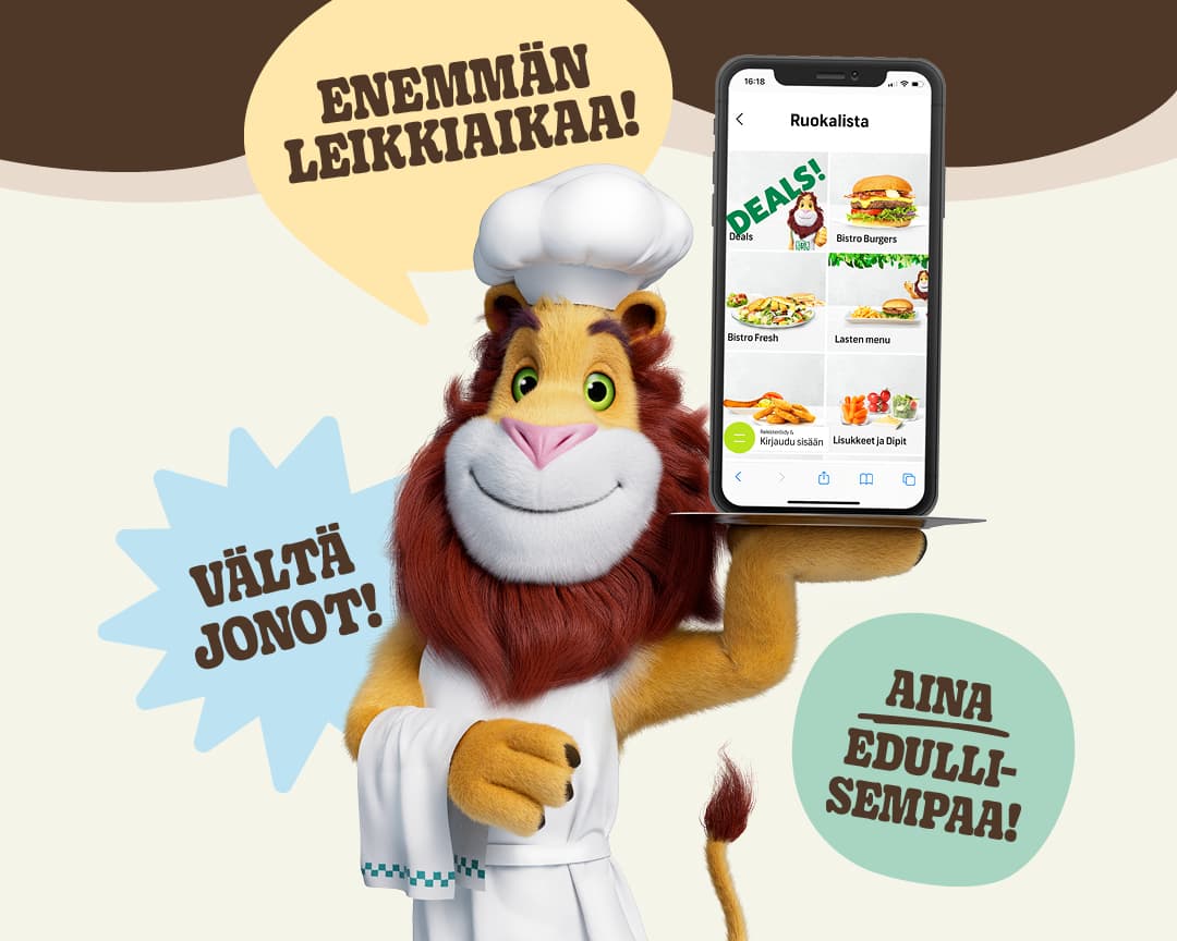 Pieni breikki piristää! Piipahda silloin Bistroon ja nauti kiirettä maukkaista ruoista ja herkuista välipaloista. Mieluista murkinaa löytyy niin lapsille kuin aikuisillekin. Leo’s Bistrossa on mukava ruokailla, sillä ravintola sijaitsee rauhallisessa paikassa etäällä leikkialueesta. Bistrossa on myös ilmainen WI-FI ja reilusti tilaa lastenvaunuille. Nyt voit tehdä myös ruokatilauksesi puhelimestasi Bistroon ja jatka seikkailuja. Ja mikä parasta, mobiilitilauksella myös säästät mukavasti.